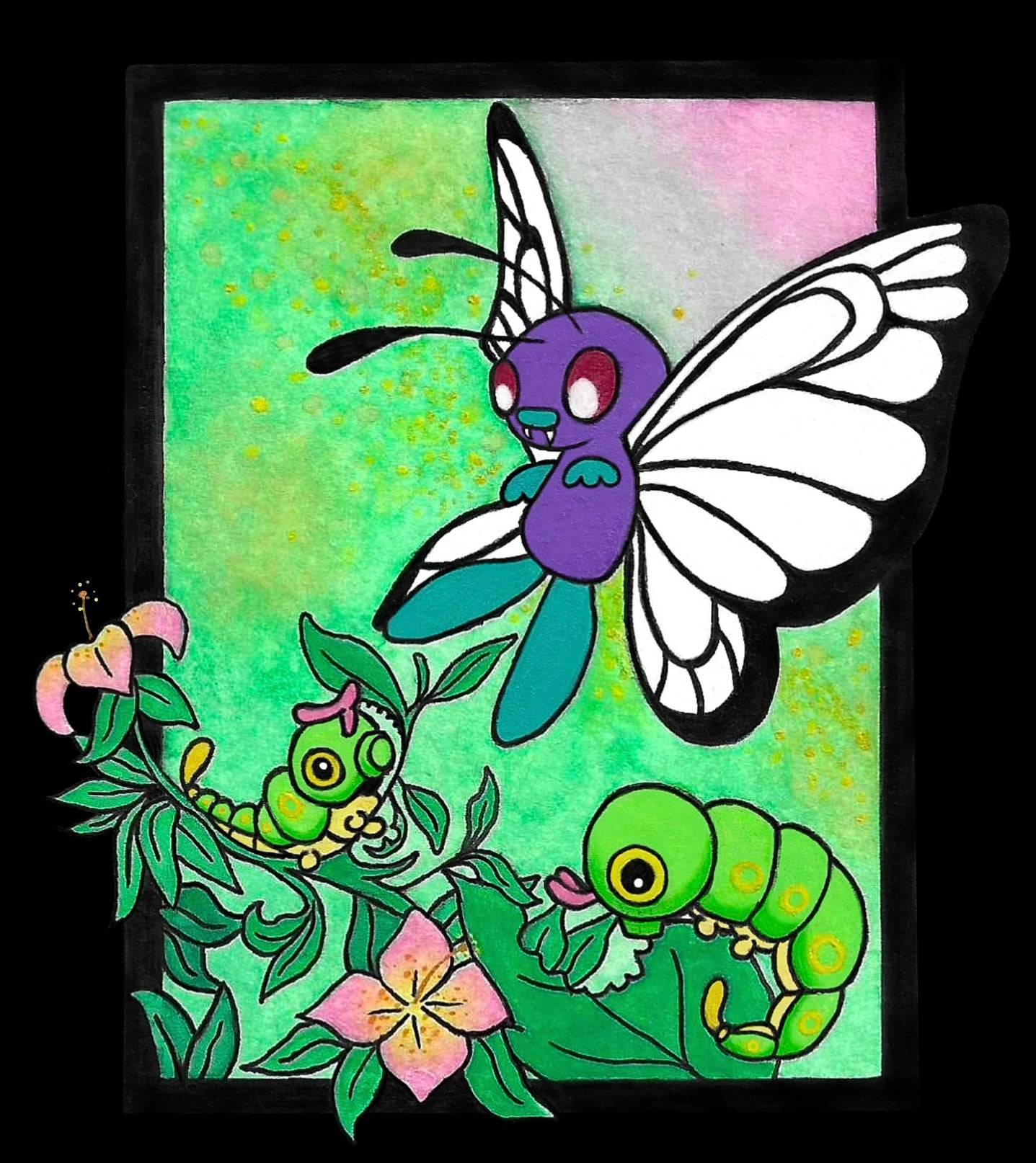 Glossy waterproof sticker of original watercolor painting of Butterfree and Caterpie.