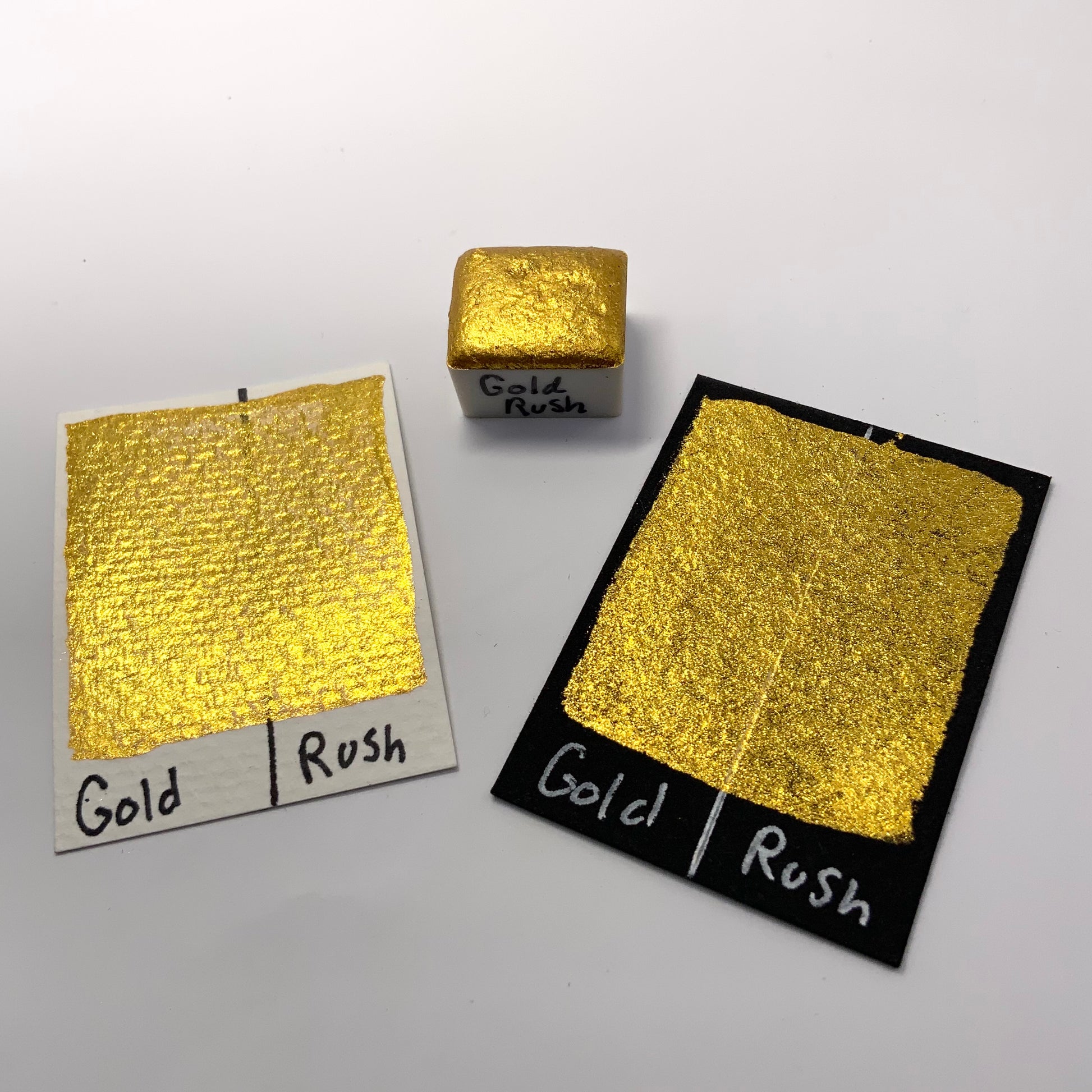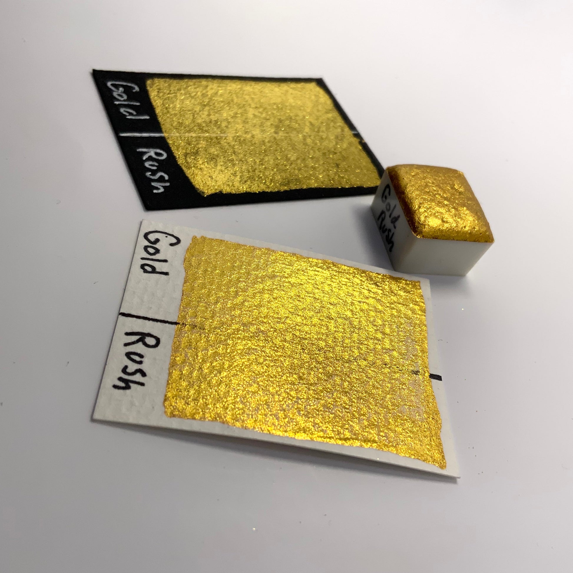 Gold rush is a bright and very reflective gold with looser particles than that of Grace of Gold. Queen's Gold is our smoothest gold, Grace of Gold has slightly looser particles for a bit more of a glittery effect, and Gold Rush here has the loosest particles, making one brush stroke come off almost like a proper glitter.