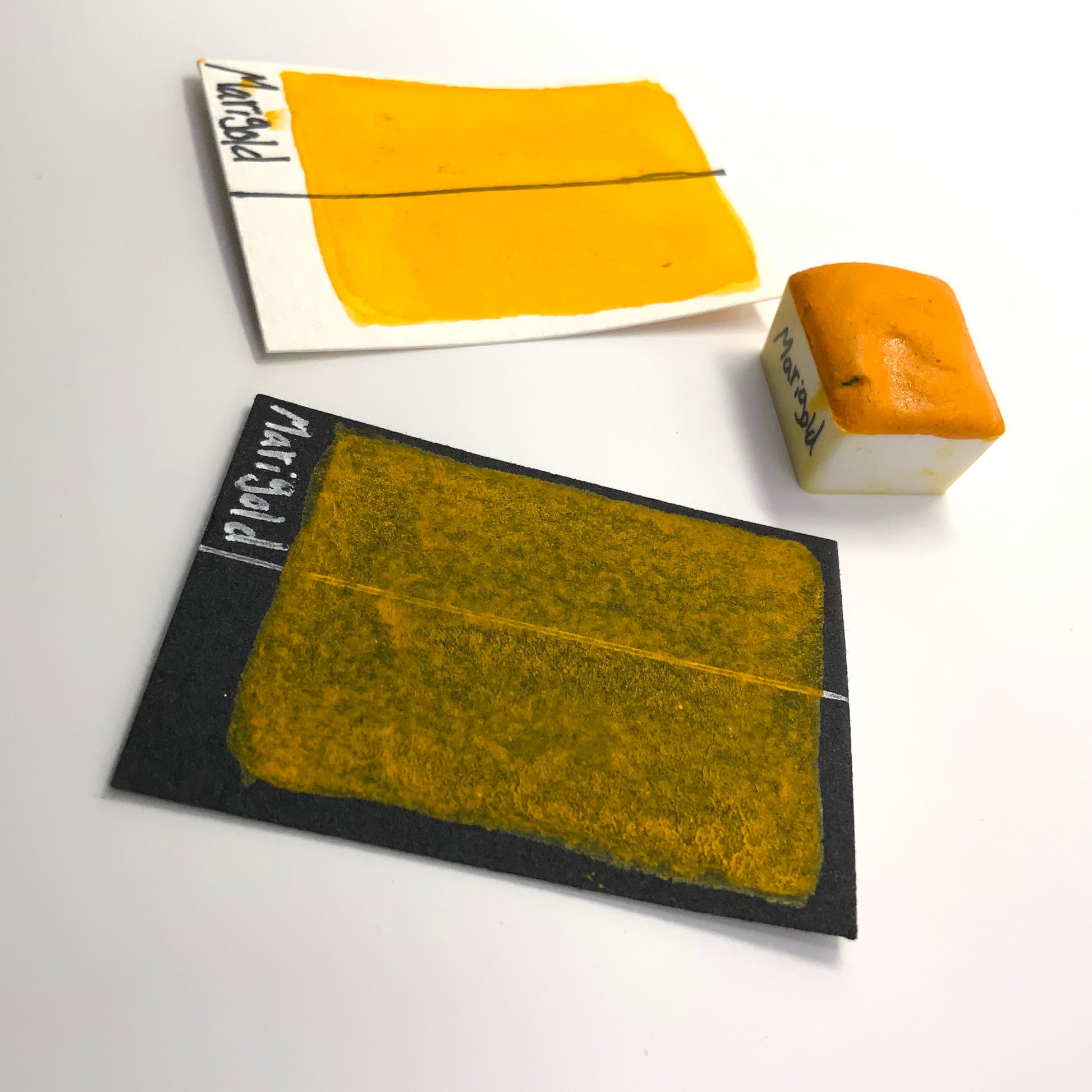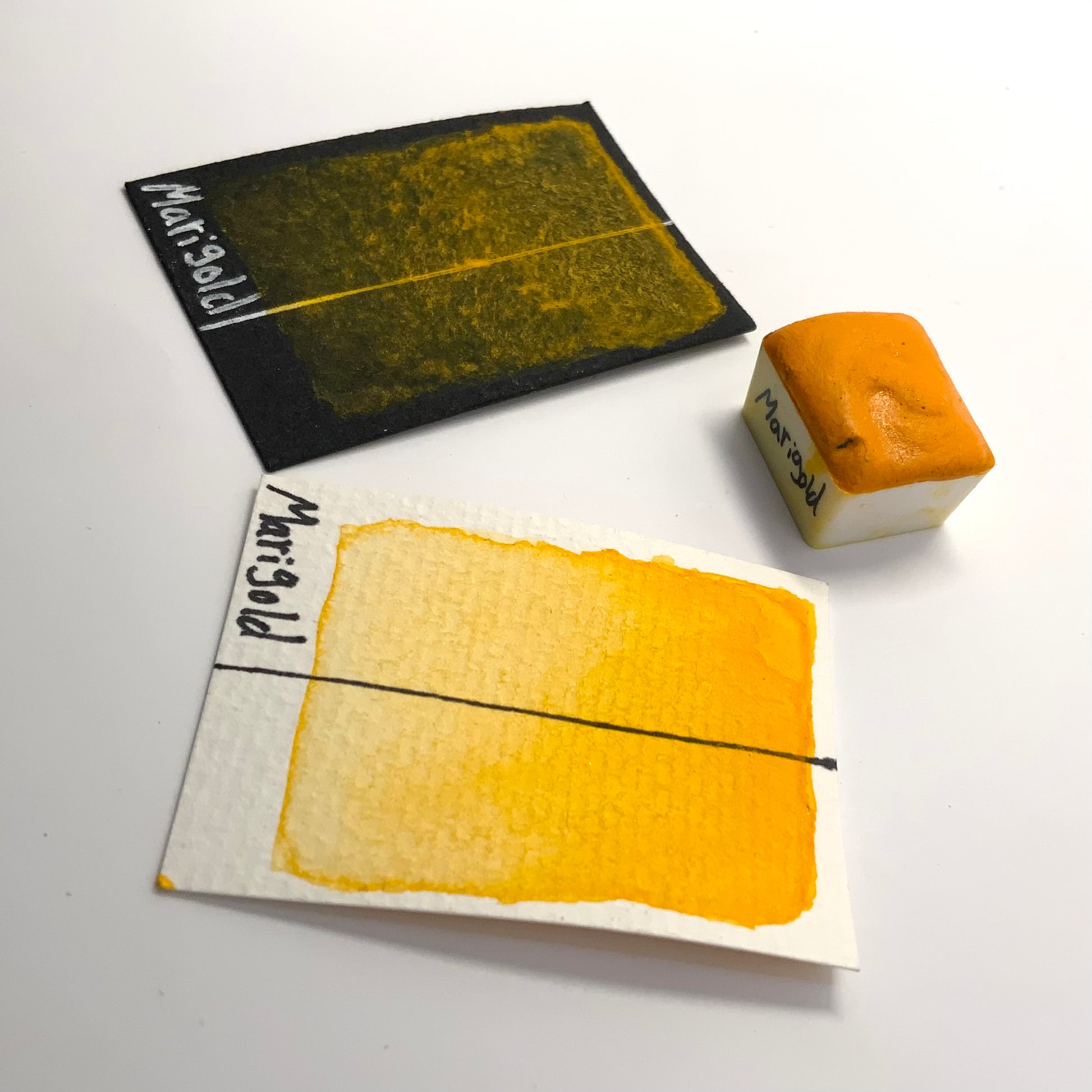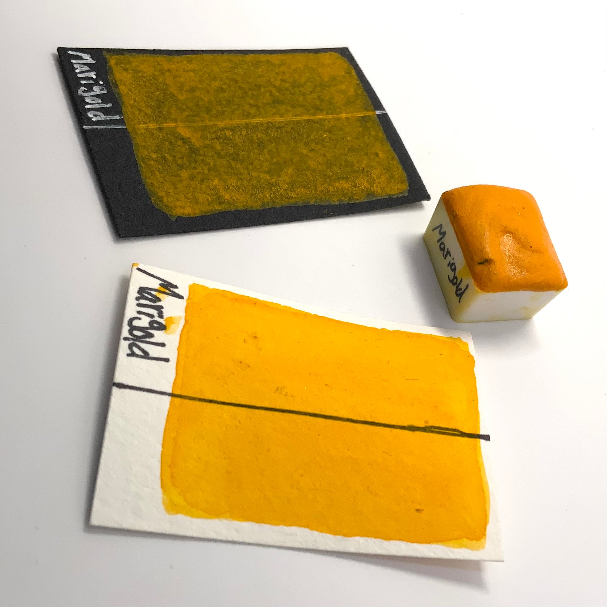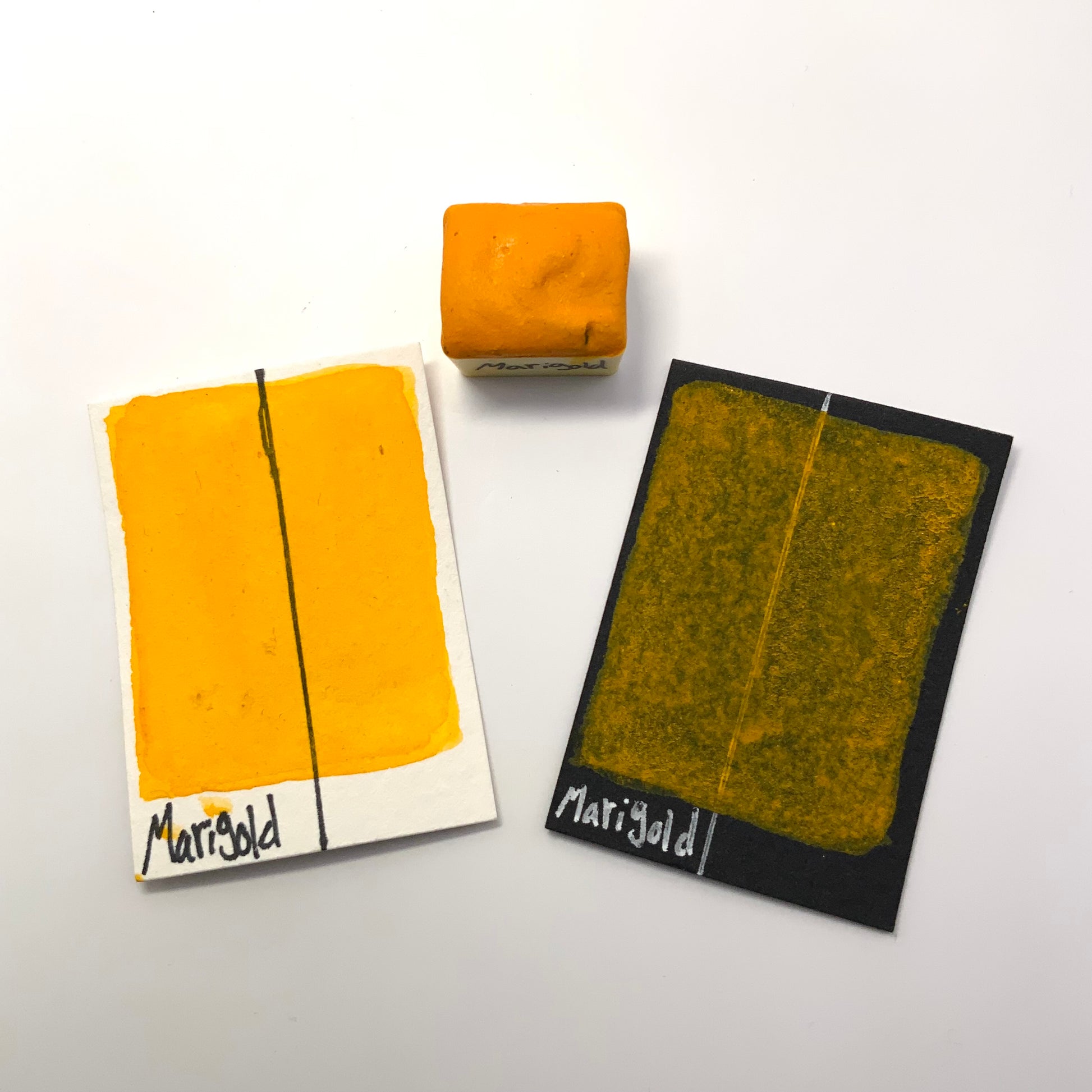 Marigold is our pure proper marigold colored paint. It comes across as a sort of seep cadmium yellow.