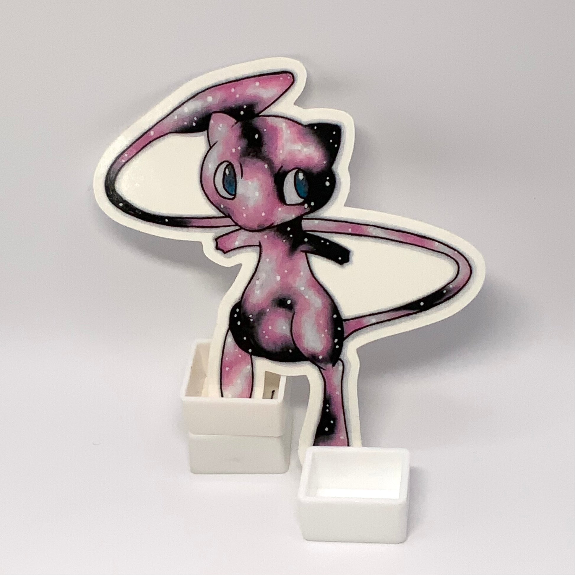 Glossy transparent waterproof sticker of original colored pencil drawing of Mew from Pokémon. The edges and negative space of this sticker are transparent.