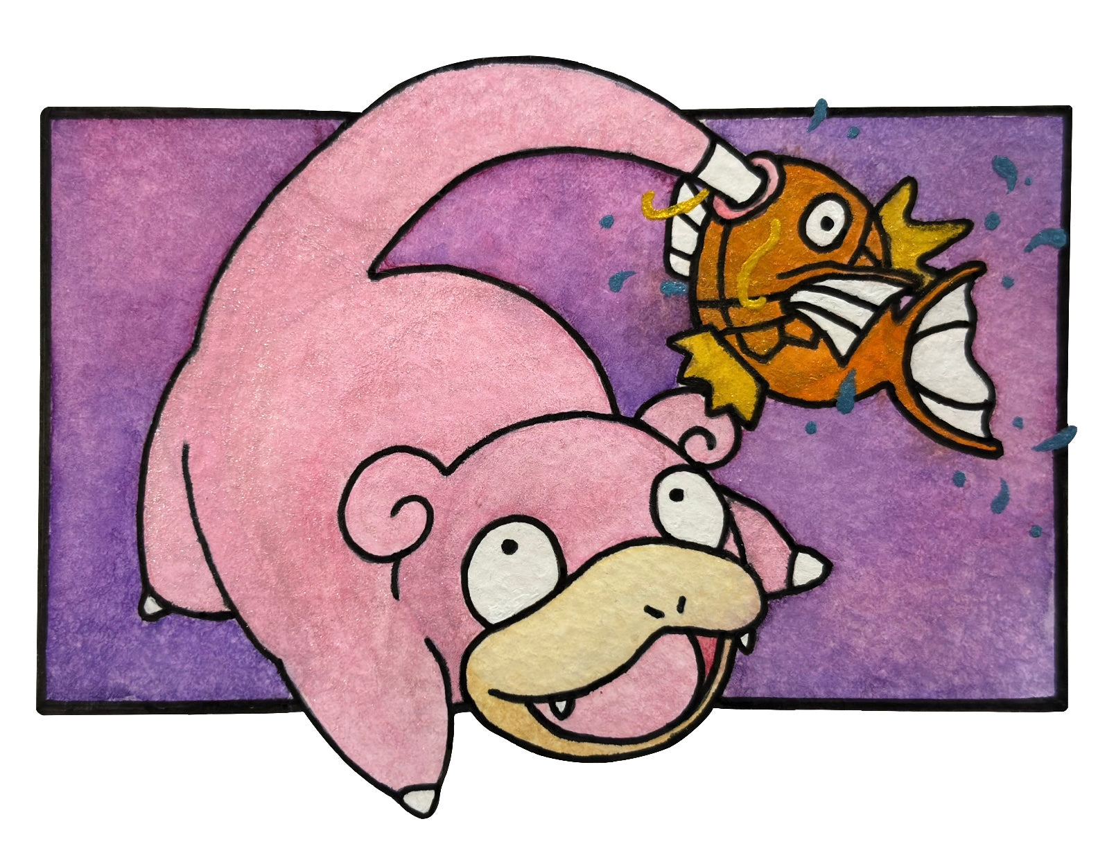 Glossy transparent waterproof sticker of original watercolor painting of Slowpoke. Catching a Magikarp.